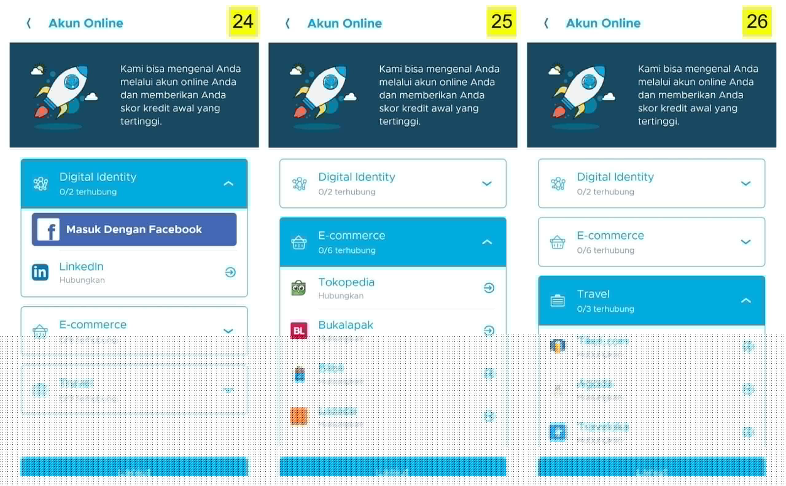 24 - 26. Melengkapi Akun Online yang mana peminjam harus mendaftarkan, paling tidak satu akun online. Beberapa pilihan jenis akun online bisa didaftarkan, mulai dari facebook, linkedIn, e-commerce (Tokopedia, Bukalapak dll) dan Travel (Traveloka dll). Harus mendaftar salah satu akun online, jika tidak maka pengajuan tidak bisa dilanjutkan.