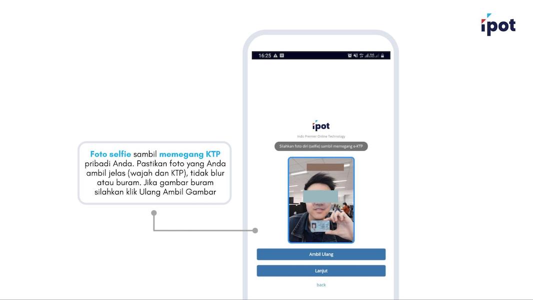 Pastikan bahwa foto diambil jelas dengan posisi wajah dan KTP terlihat jelas. KTP yang diambil foto harus sama dengan KTP yang digunakan. Ada pilihan untuk ambil gambar ulang jika foto tidak jelas.